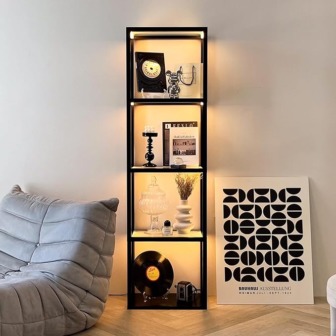 FENLO Fantasy Plus Pro - 66" LED Glass Display Shelf with Dimmable LED Floor Lamp, Curio Cabinet with Adjustable Color Temp, Open Display Cabinet for Collectibles, Long Lasting LED
