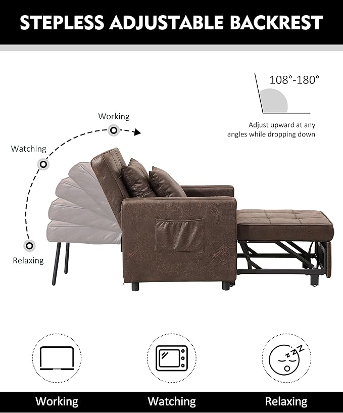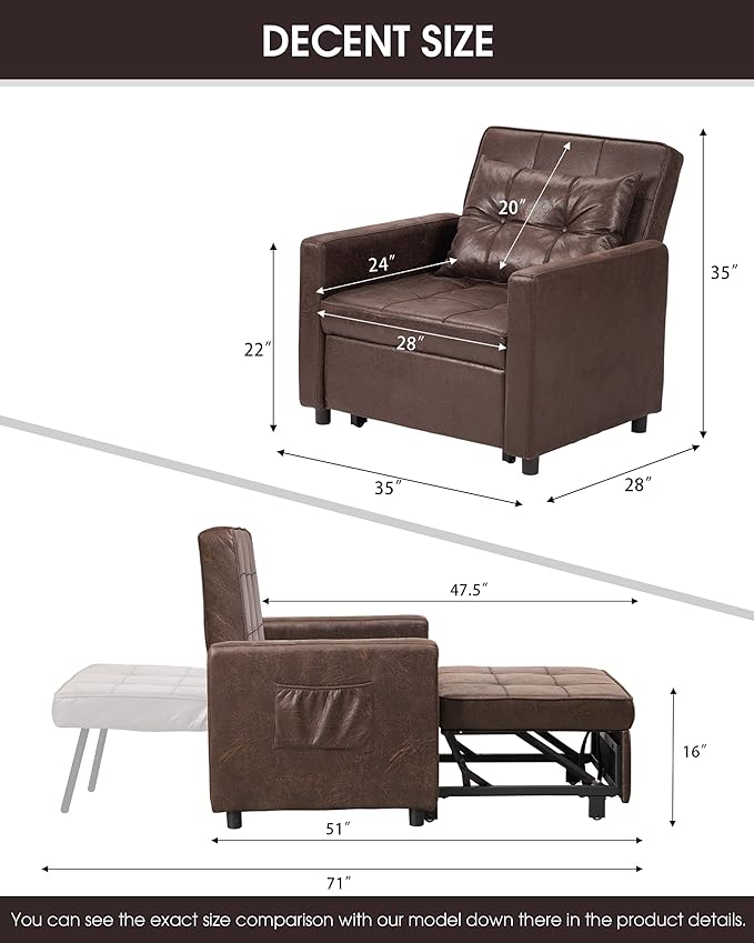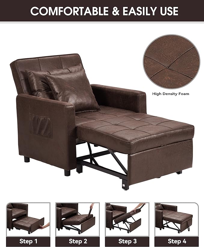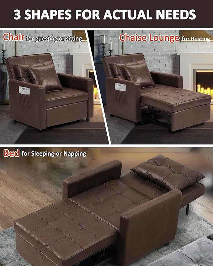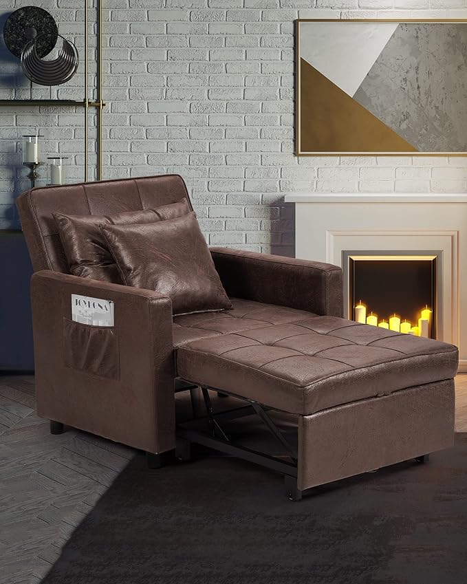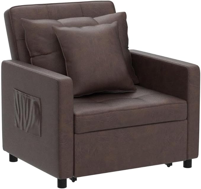 XSPRACER [UPDATED] Convertible Chair Bed, Sleeper Chair Bed 3 in 1, Stepless Adjustable Backrest,Armchair, Sofa, Bed, PU Imitation, Brown, Single One