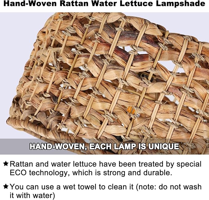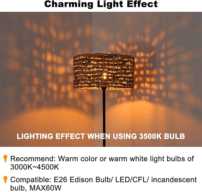 Unique Farmhouse Floor Lamp for Living room, Bedroom and Office, Original Handmade Water Lettuce Rattan Shade Tall Standing Light Black , Modern Vintage Rustic Rural Décor(No Bulbs)