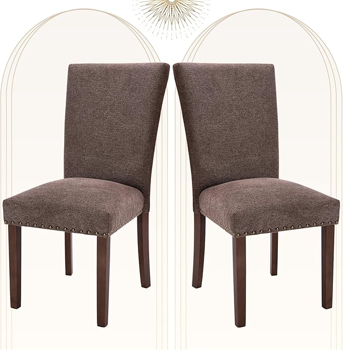 COLAMY Upholstered Parsons Dining Chairs Set of 2, Fabric Dining Room Kitchen Side Chair with Nailhead Trim and Wood Legs - Brown