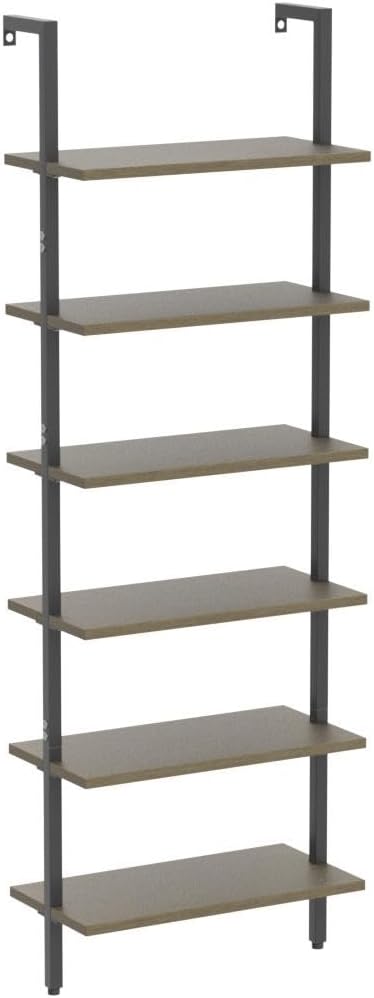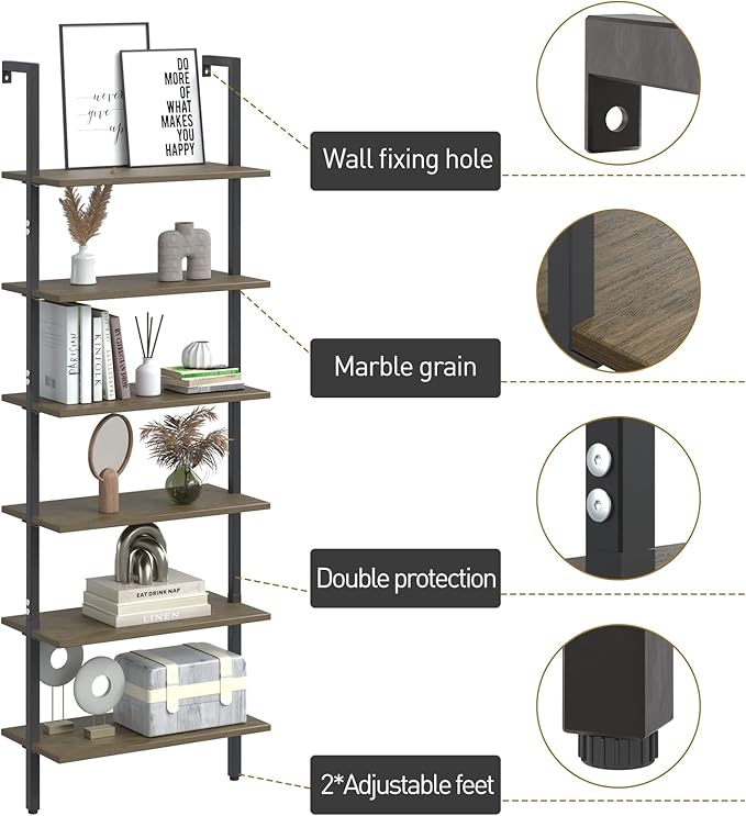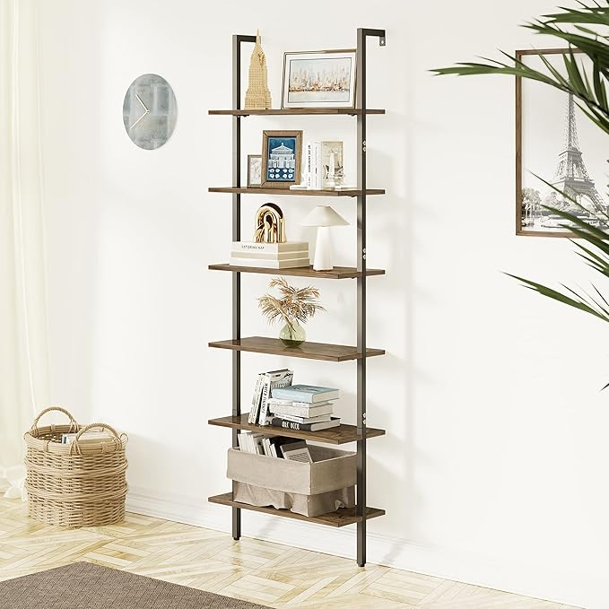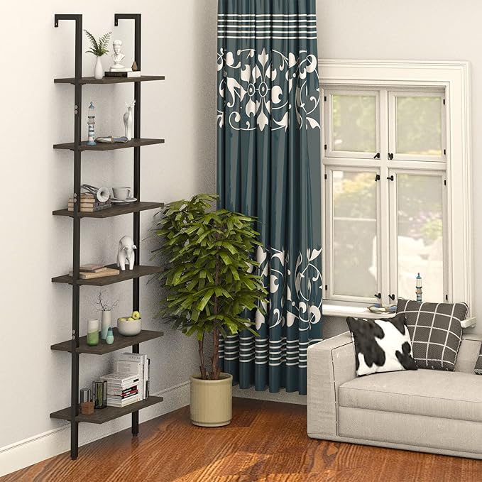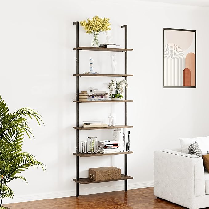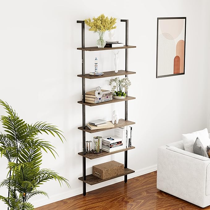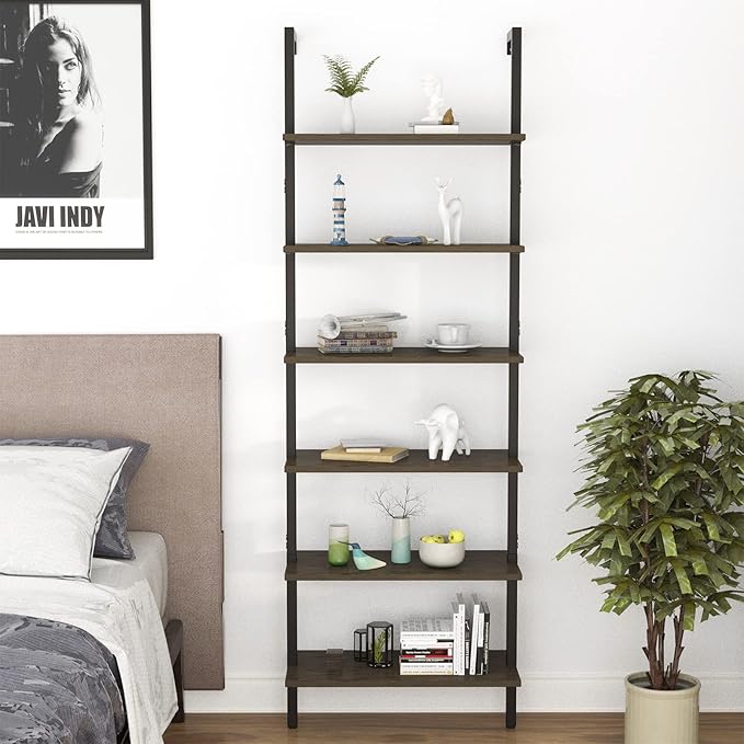 Ladder Shelf Black 6 Tiers Modern Bookshelf Room Organizer Open Tall Wall Mount Bookcase Standing Leaning Wall Shelves Industrial Decorative Living Room Bed Room