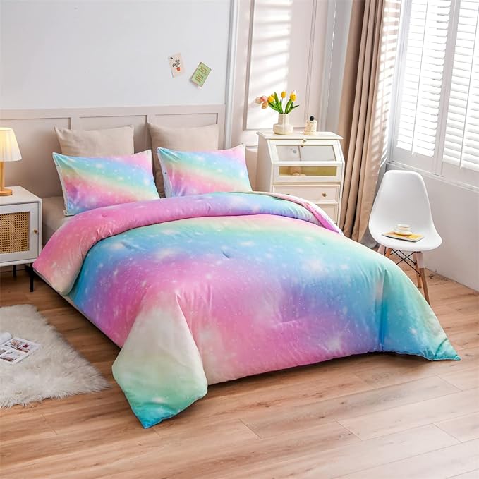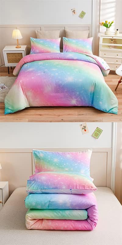 Holawakaka Girls Ombre Glitter Comforter Set, Full Size Gradient Rainbow Galaxy Print Kids Bedding Sets, Multi-color Ultra-soft Dorm Bed Set (Pink Green, Full)