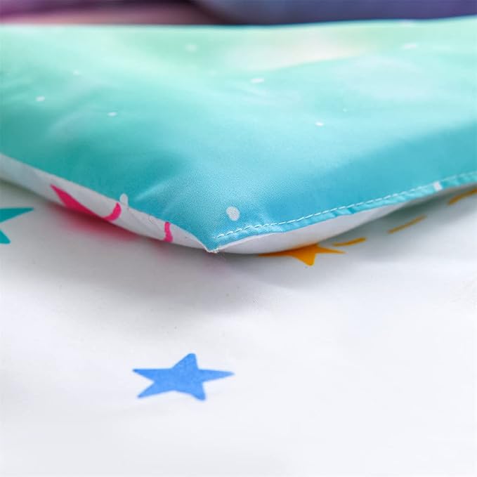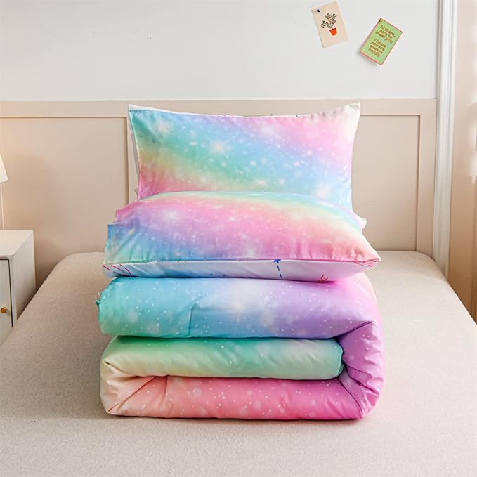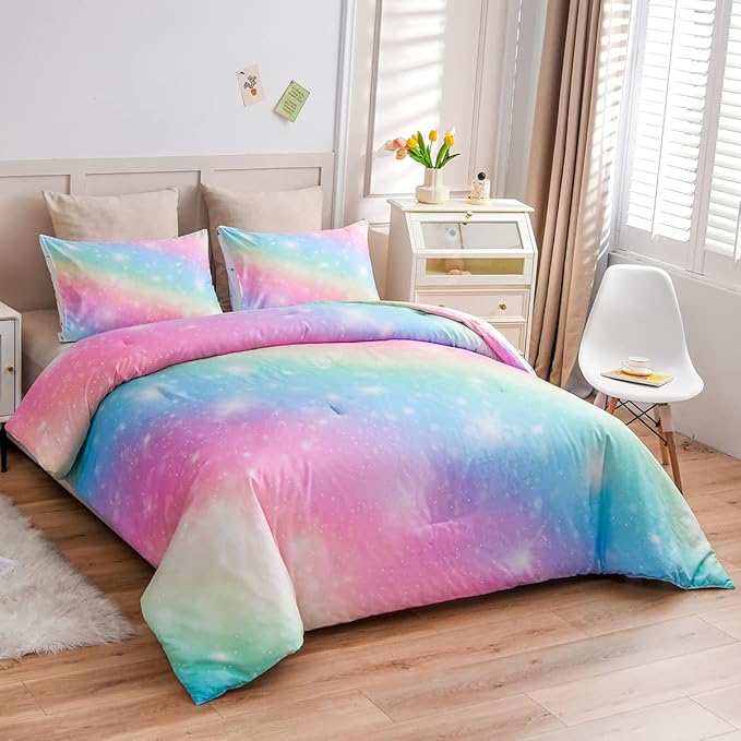 Holawakaka Girls Ombre Glitter Comforter Set, Twin Size Gradient Rainbow Galaxy Print Kids Bedding Sets, Multi-color Ultra-soft Dorm Bed Set (Pink Green, Twin)