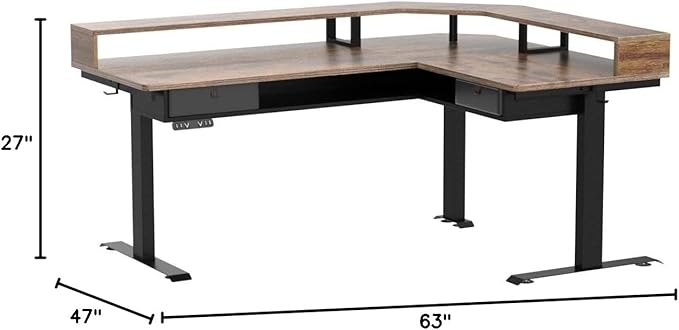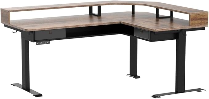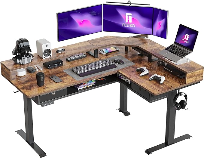 FEZIBO 63" L Shaped Standing Desk with LED Strip, Electric Triple Motor Sit Stand up Corner Desk Height Adjustable with Monitor Stand & Shelves, 2 Drawers, Ergonomic Home Office Desk, Rustic Brown