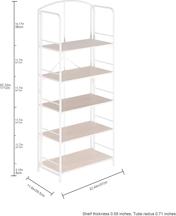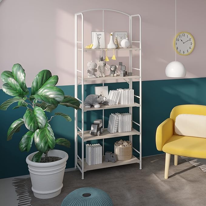 No Assembly Folding Bookshelf, Metal Book Shelf for Storage, Folding Bookcase for Office Organization and Storage (White, 5 Tiers)