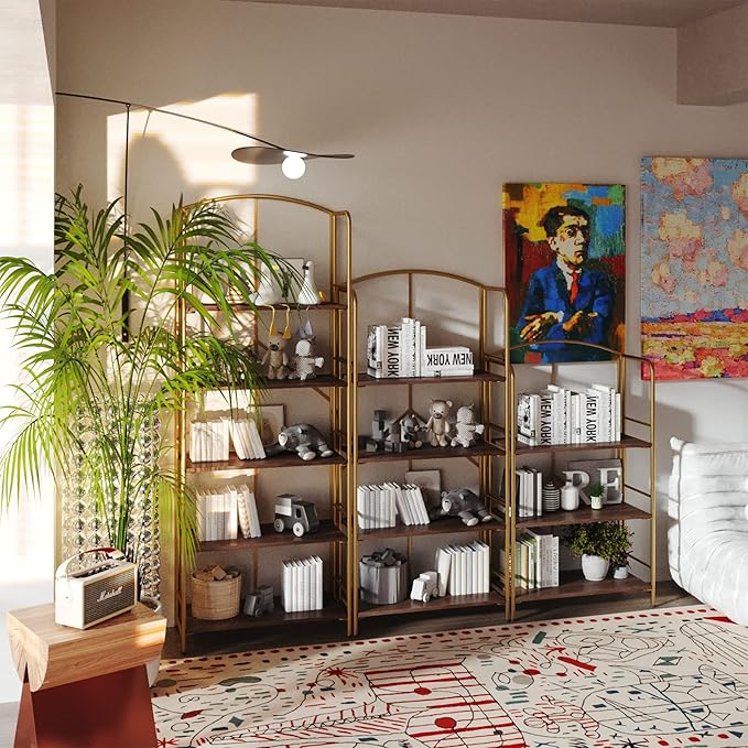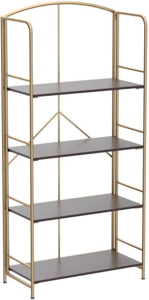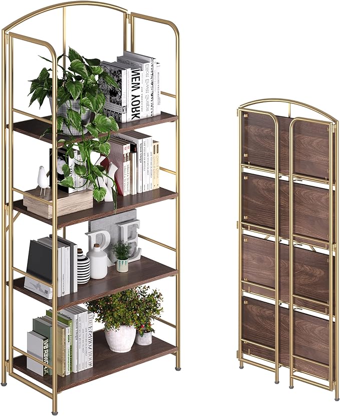 No Assembly Folding Bookshelf, Metal Book Shelf for Storage, Folding Bookcase for Office Organization and Storage (Brown and Gold, 4 Tiers)