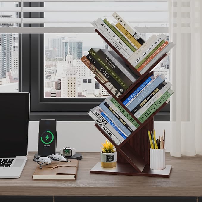 Tree Bookshelf, 5 -Tier Book Storage Organizer Shelves Floor Standing Bookcase, Wood Storage Rack for Office Home School Shelf Display for Cd/Magazine (Dark Walnut)