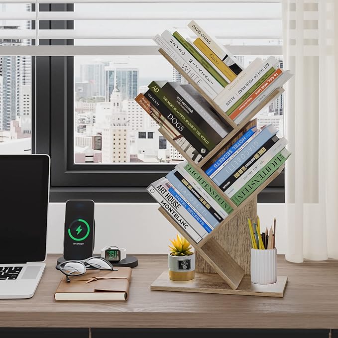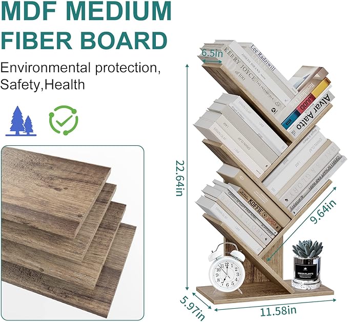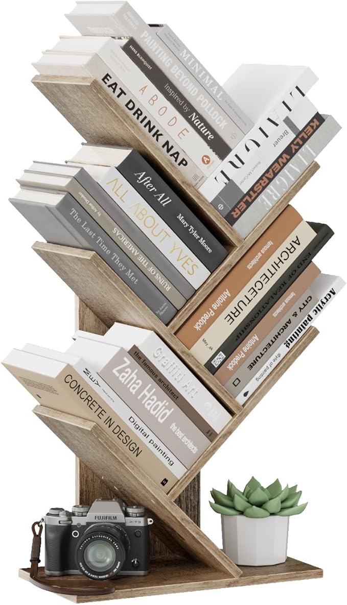 Tree Bookshelf, 5 -Tier Book Storage Organizer Shelves Floor Standing Bookcase, Wood Storage Rack for Office Home School Shelf Display for Cd/Magazine (French Oak Grey)