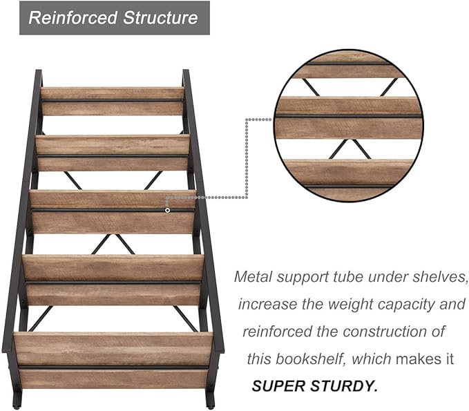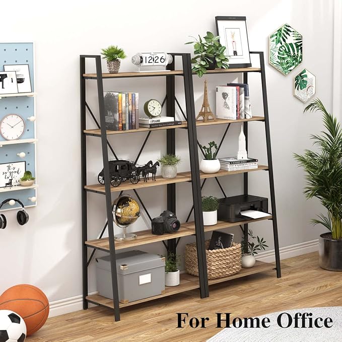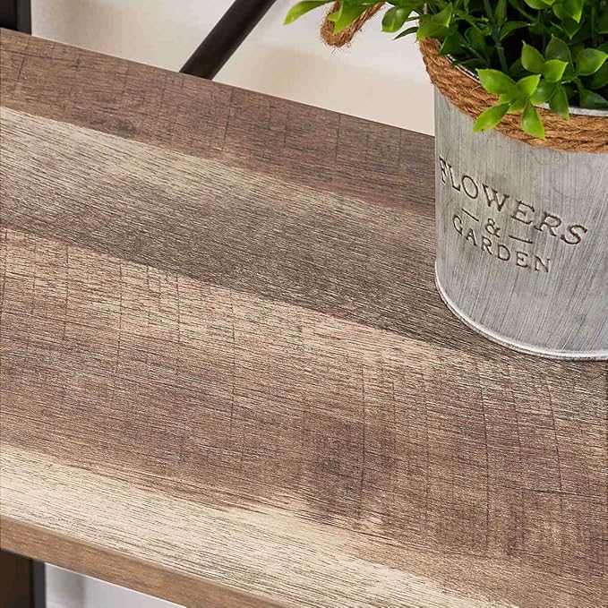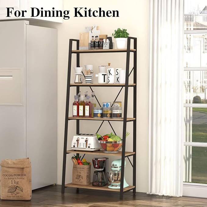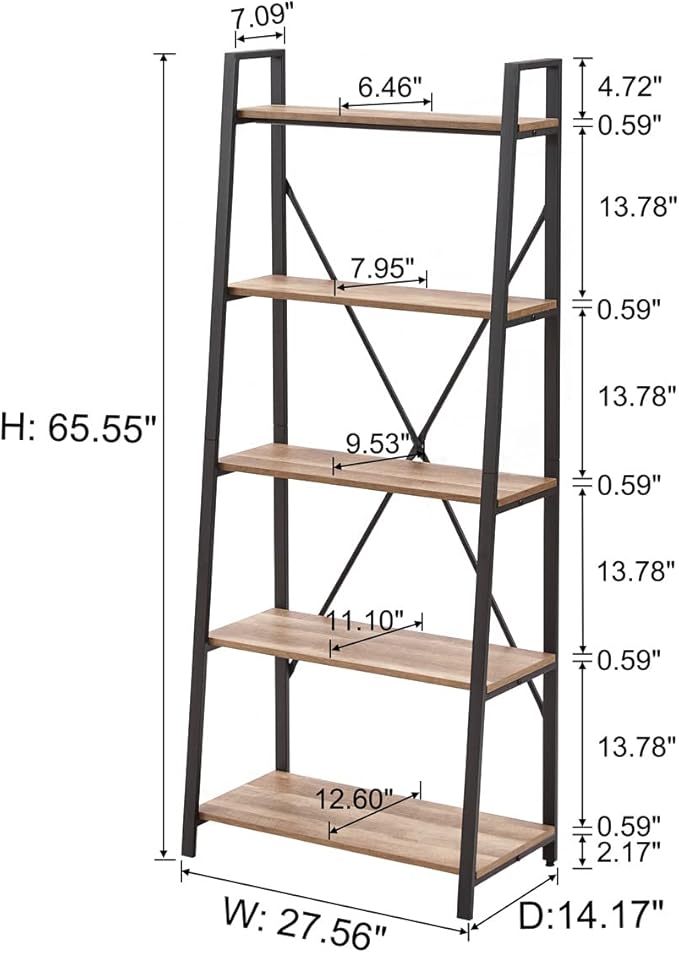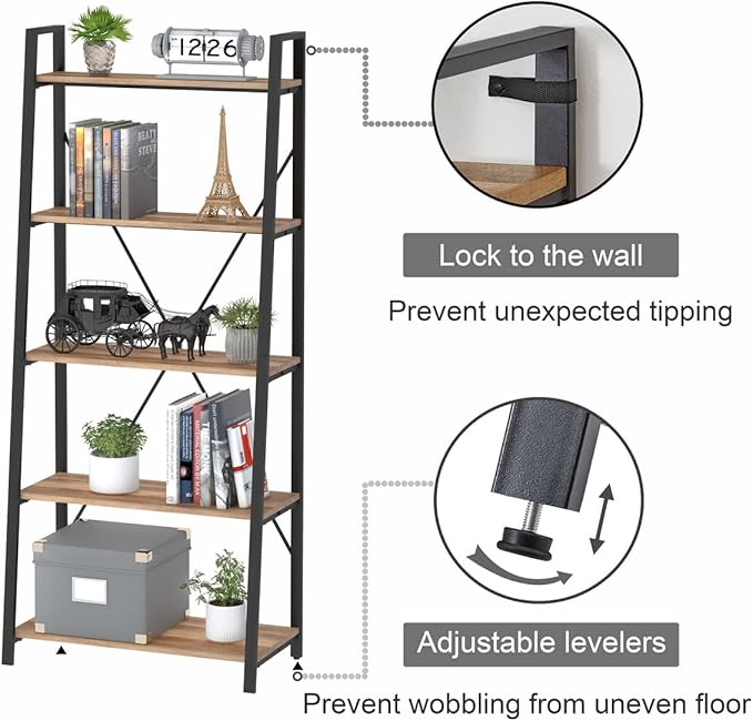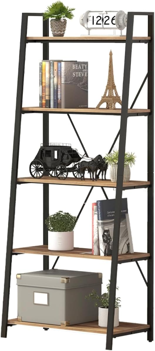 BON AUGURE Industrial 5 Tier Ladder Bookshelf, Wood and Metal Ladder Shelf Bookcase, Farmhouse Leaning Shelves for Living Room (Vintage Oak)