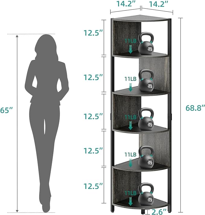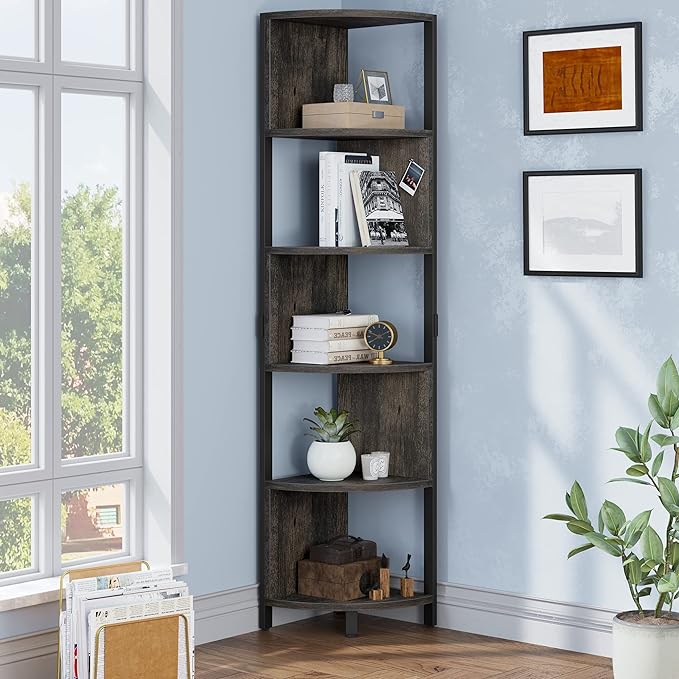 YITAHOME 6-Tier Corner Shelf, 68.8" Tall Industrial Free Standing Corner Bookshelf, 6 Shelf Display Corner Bookcase Open Small Book Shelves for Bedroom, Living Room, Small Space, Charcoal Gray + Black