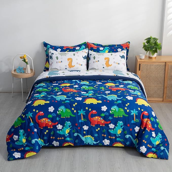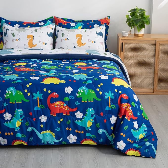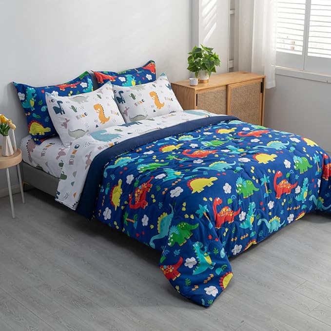 Wajade 7 Piece Kid Boys Dinosaur Comforter Set Queen Size 3D Blue Dinosaur Wild Park Jungle Print Bedding Set with Comforter, Sheet Set, Pillowcase and Sham