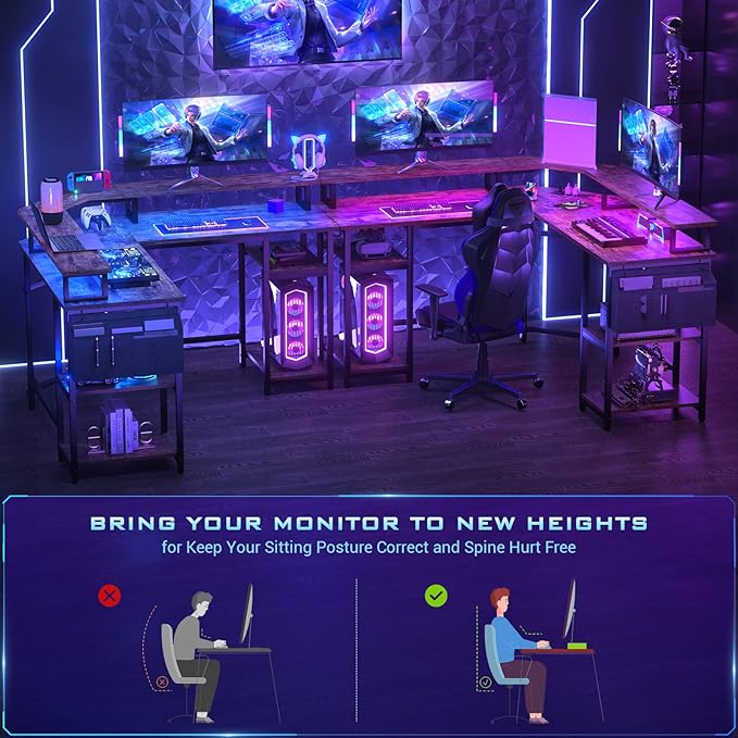 Aheaplus L Shaped Gaming Desk with Power Outlets & LED Lights, Corner Computer Desk with Monitor Stand and Storage Shelf, Home Office Writing Desk with Storage Bag, Rustic Brown