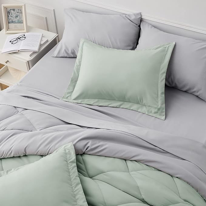 Bedsure Sage Green Twin Comforter Sets - 5 Pieces Reversible Twin Bedding Sets for College, Sage Green Extra Long Bed Set Twin with Comforters, Sheets, Pillowcase & Sham