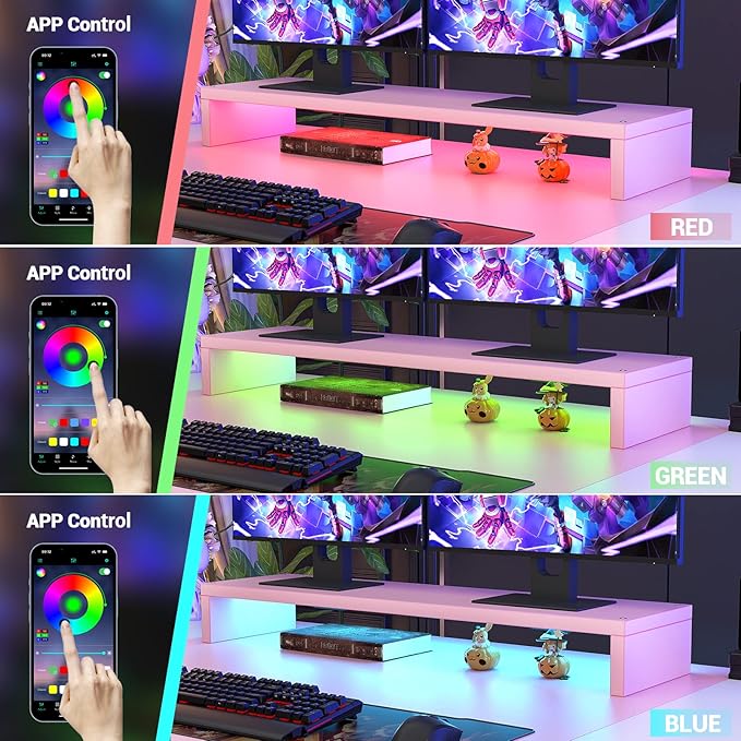 armocity Computer Desk with LED Lights, 48 Inch Desk with Power Outlet and USB, Reversible Large Desk with Moveable Monitor Stand, 48'' Gaming PC Table for Home Office, Workstation, Pink and White