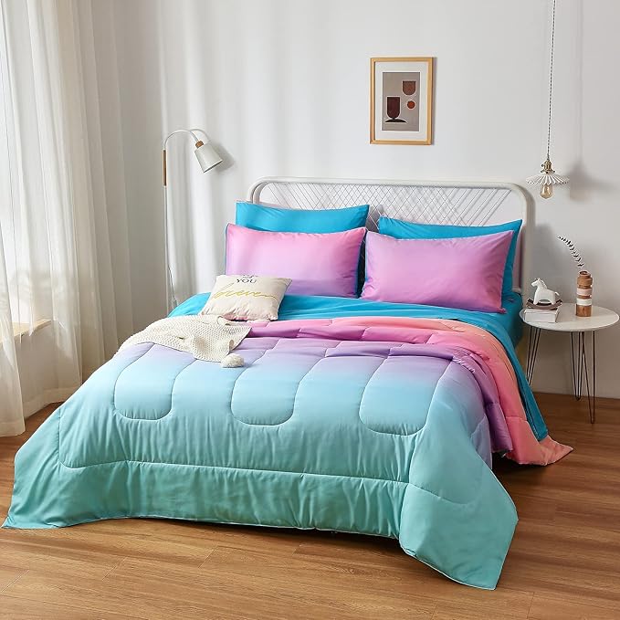inron Rainbow Kids Comforter Sets for Girls Women,Full Size 5-Pieces Bed in a Bag, Ultra Soft Microfiber Comforter and Sheet Sets, All Season Durable Bedding Set(Rainbow,Full)
