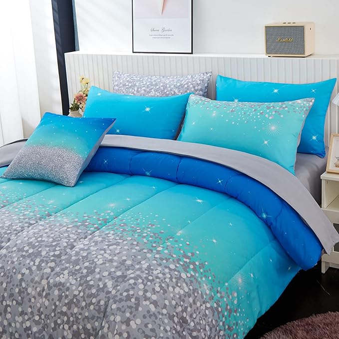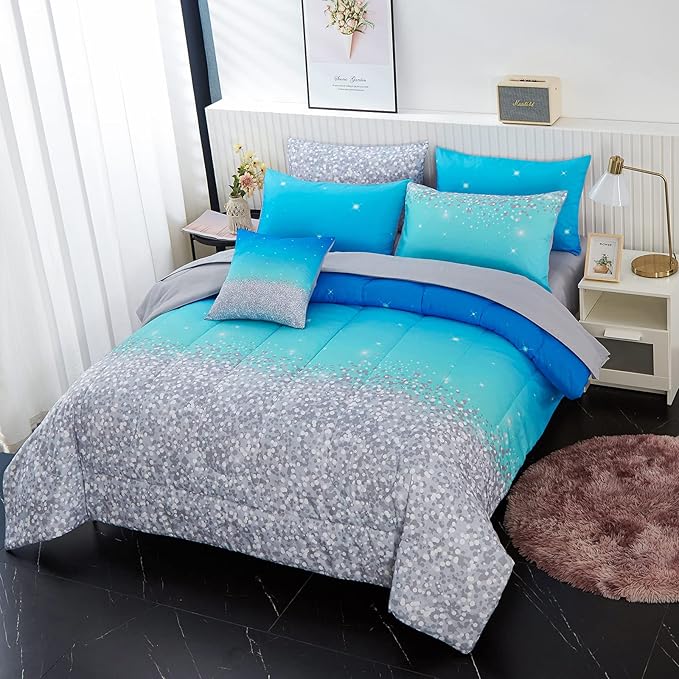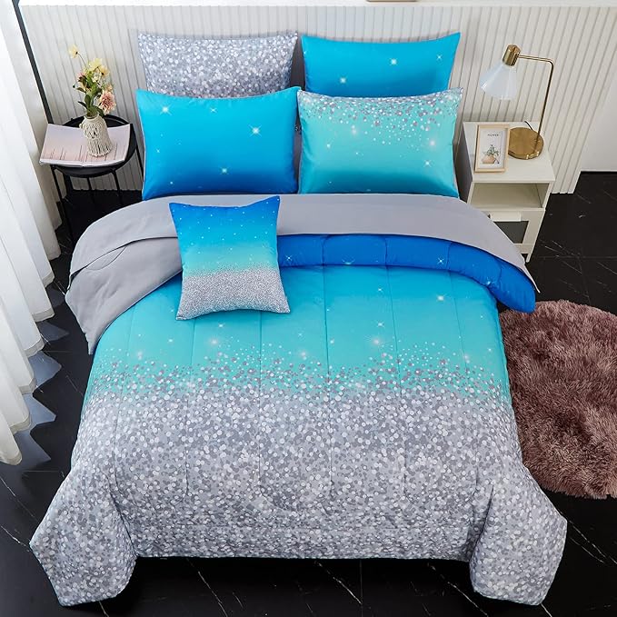 inron Aqua Glitter Comforter Sets for Girls Women,Full Size 5-Pieces Bed in a Bag Ultra Soft Microfiber Comforter and Sheet Sets, All Season Durable Bedding Set(Aqua,Full)