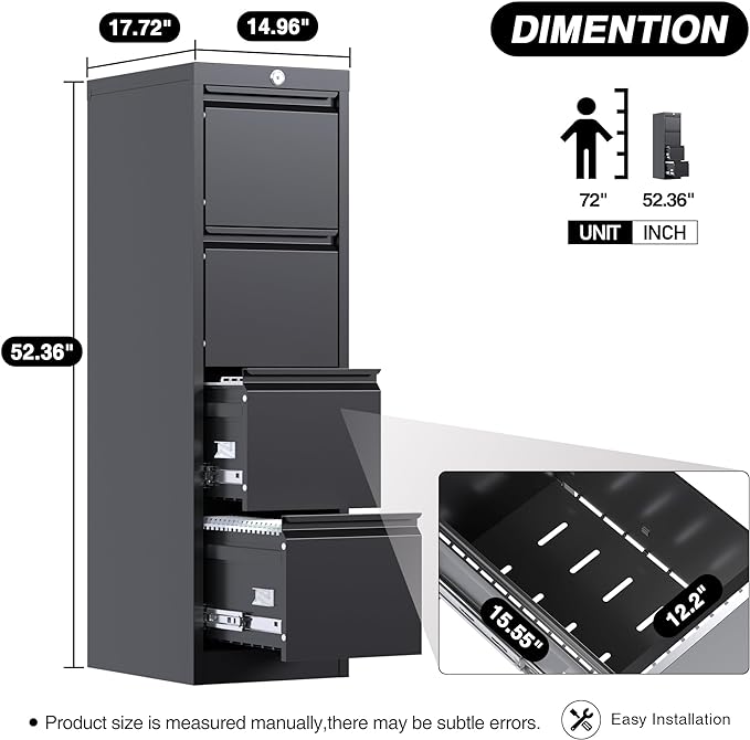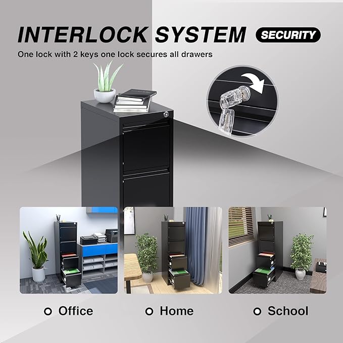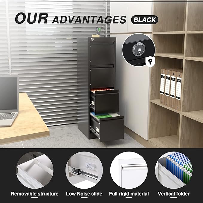 4 Drawer File Cabinet, Vertical Filing Cabinets with Lock, Metal File Cabinets for Home Office A4 Letter/Legal Size, Assembly Required
