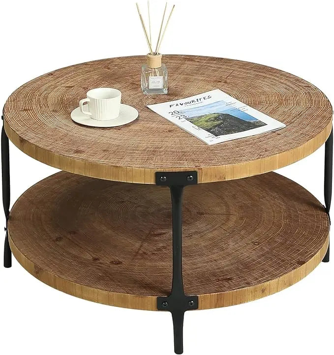 Round Boho Wood Coffee Table - 29.1" Farmhouse Natural Circle Wooden 2-Tier Coffee Tables Living Room Furniture, Natural Wood Color, 29.1" D x 18.3" H