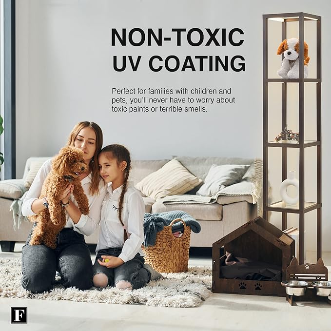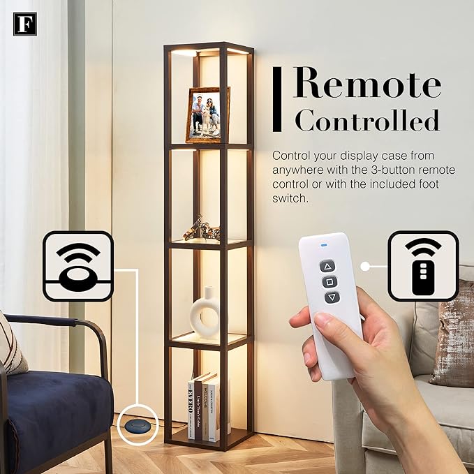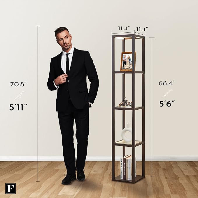 FENLO Fantasy 66" Luxury Glass Display Shelf with Dimmable LED Floor Lamps, Sturdy Glass Shelves for Bedroom, Curio Cabinet with Glass Bookshelf, Floor Lamp with Shelves - Brown