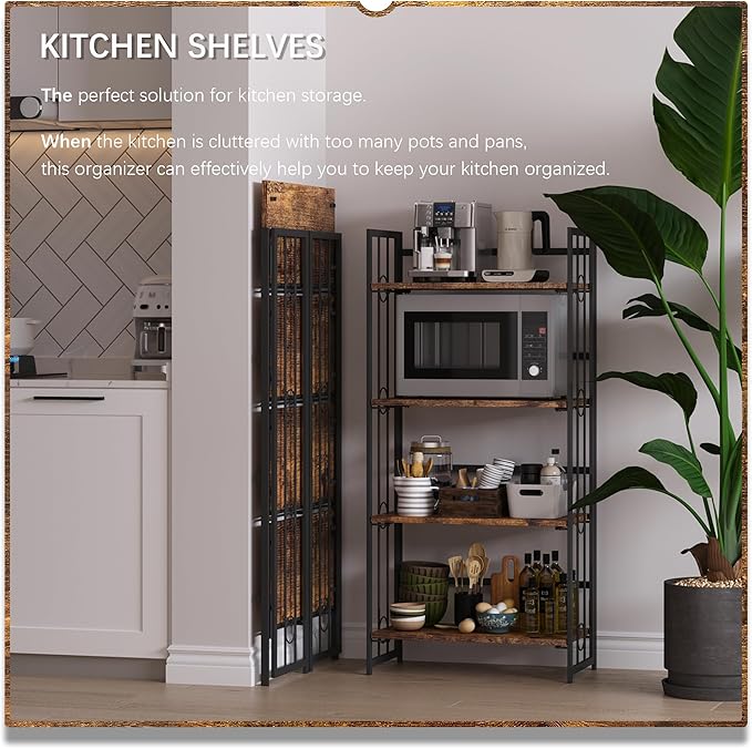 4NM No-Assembly 4 Tiers Folding Bookshelf Storage Shelves Vintage Bookcase Standing Racks Study Organizer Home Office - Rustic Brown and Black