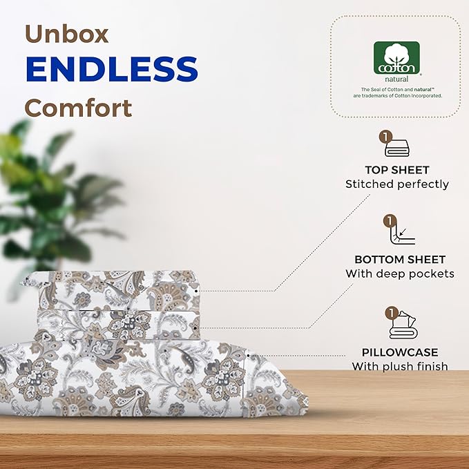THREAD SPREAD 100% Egyptian Cotton Printed Bed Sheets - 600 Thread Count 3 PC Twin XL Sheet Set, Hotel Luxury Sateen Bedsheets, 16" Deep Pocket Cooling Sheets for Twin XL Size Bed - Floral Ivory