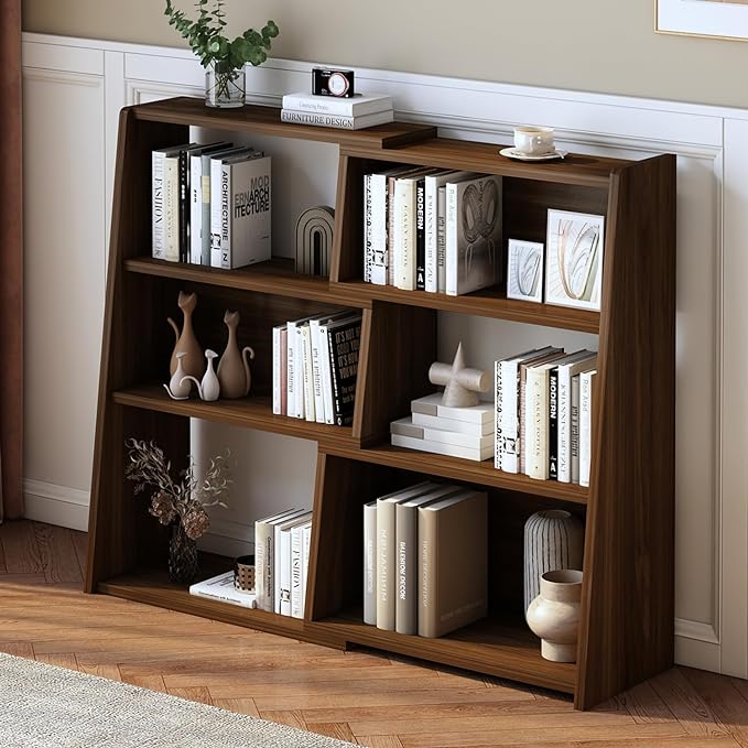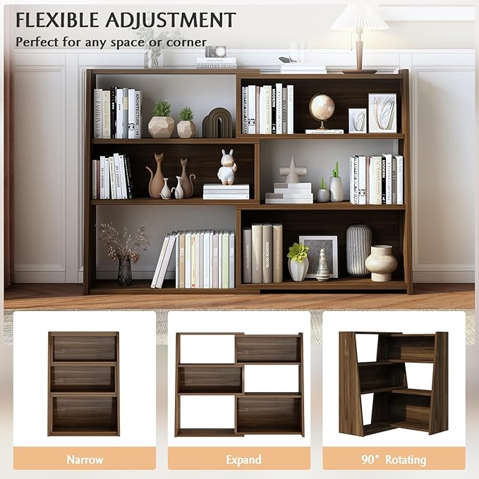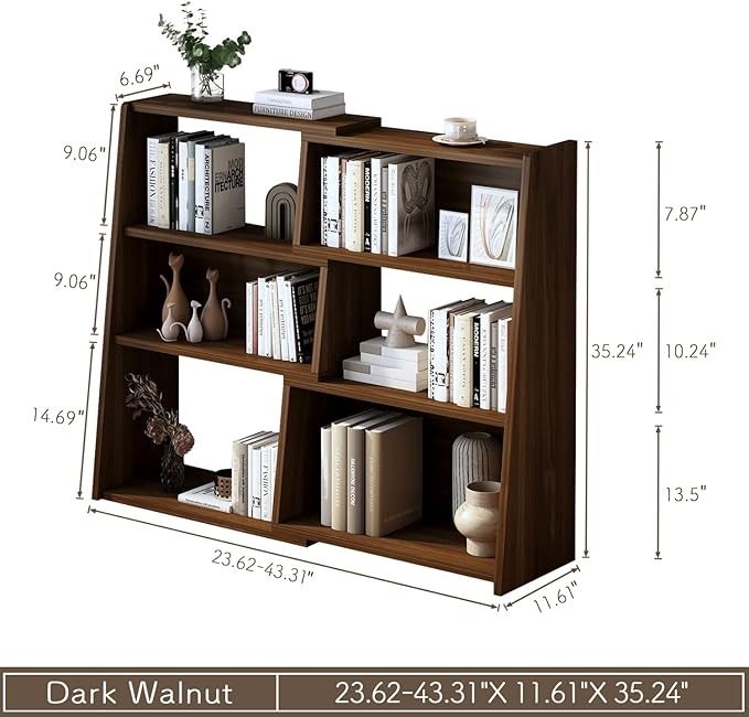 IOTXY Wooden Extendable Shelf Bookcase - 3-Tier Ladder Low Short Bookshelf for Small Space or Corner, Dark Walnut, S