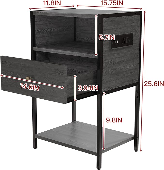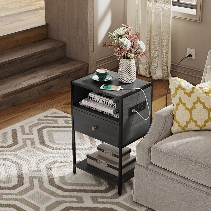 LDTTCUK Nightstand with Charging Station, Modern End Table with Drawer, Bedside Table with Open Storage for Bedroom, Grey