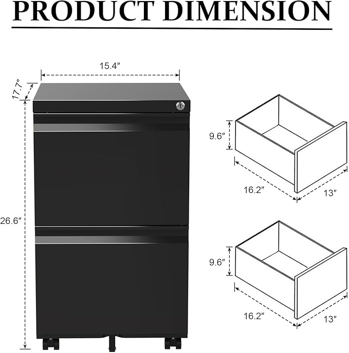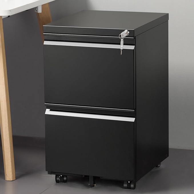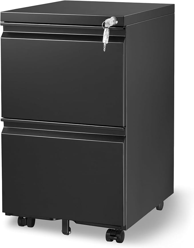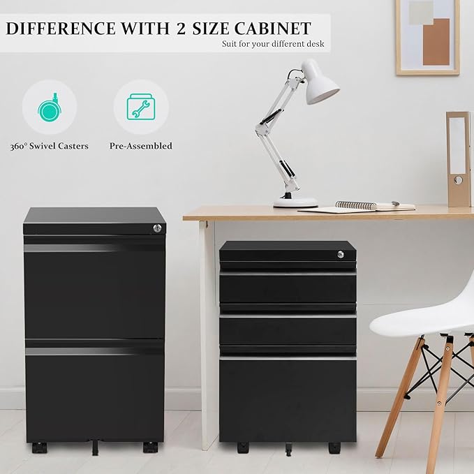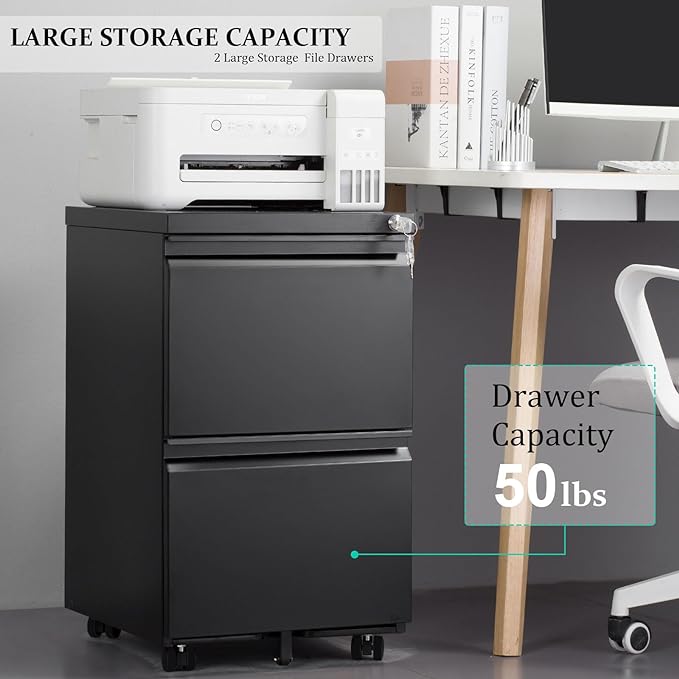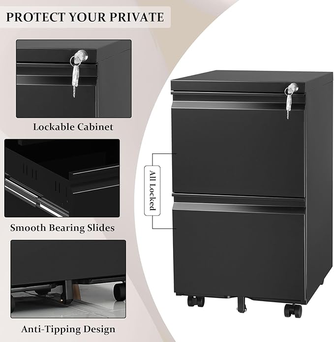 2-Drawer Mobile File Cabinets Rolling Metal Filing Cabinet for Legal & Letter File Anti-tilt Design with Lock Under Desk Office Drawers Fully Assembled Except Casters Black