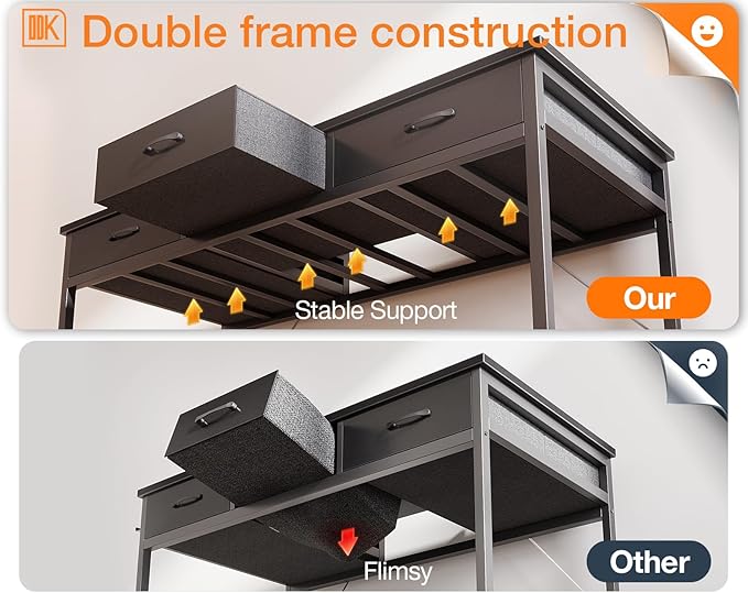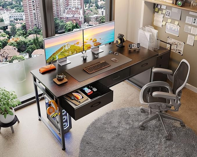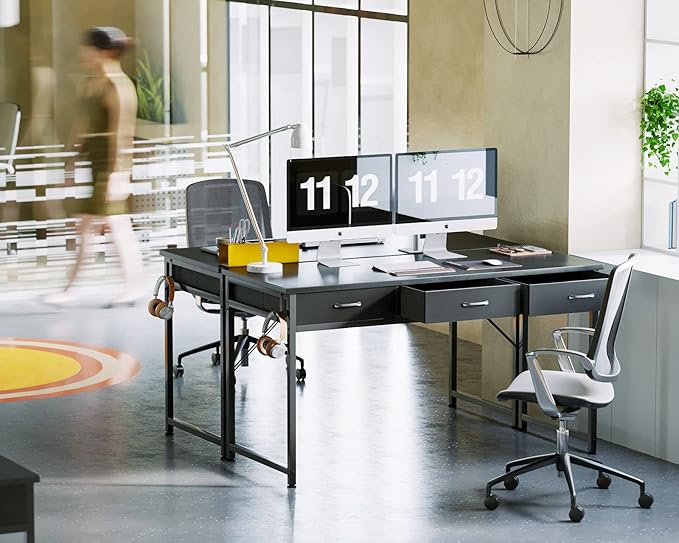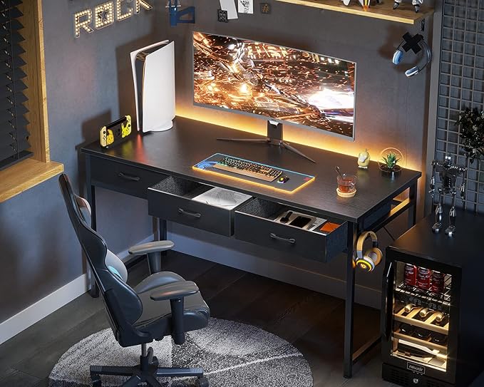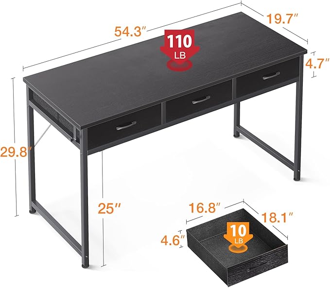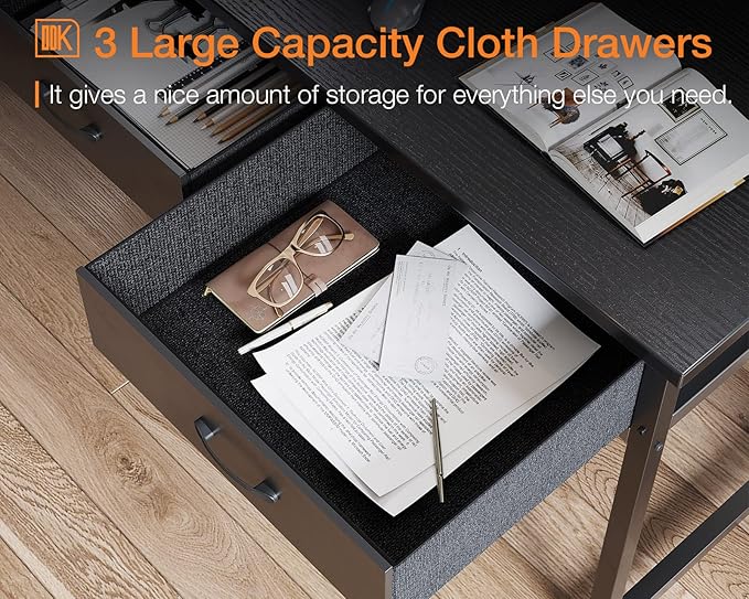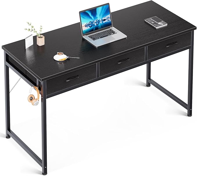 ODK 55 Inch Computer Desk with 3 Cloth Drawers for Home Office, Vanity Desk with Storage and Hook for Bedroom, Work Desk, Study Writing Table, Black