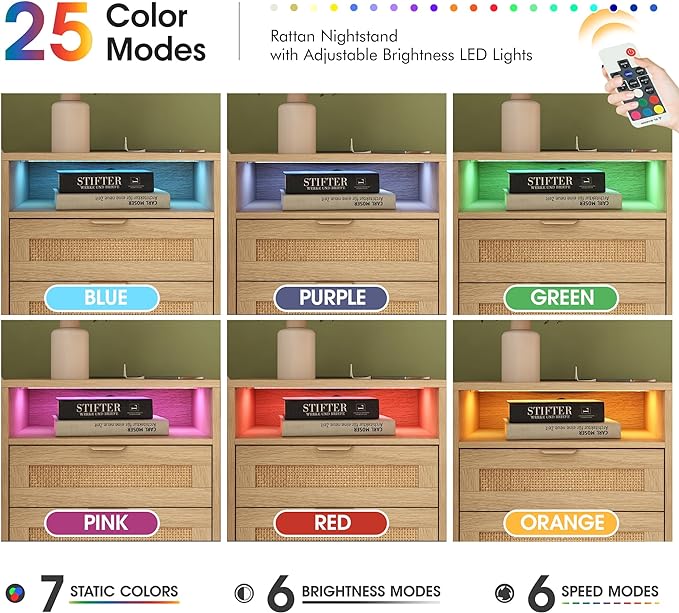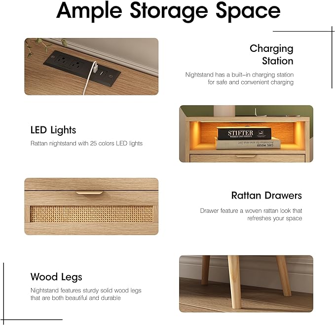 Rattan Nightstand with Charging Station USB Port Led Lights and 2 Storage Drawers, Bedroom Furniture Night Stand Bedside Table Bed Side Table End Table Sofa Table (1 Pack)