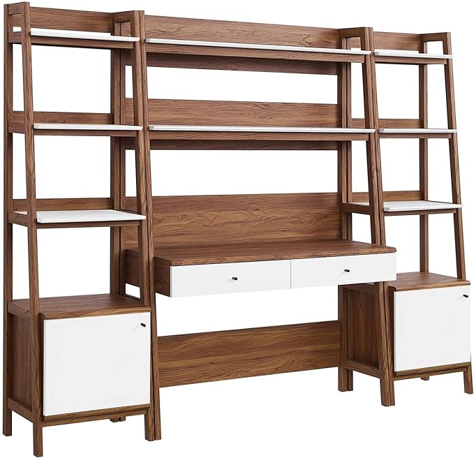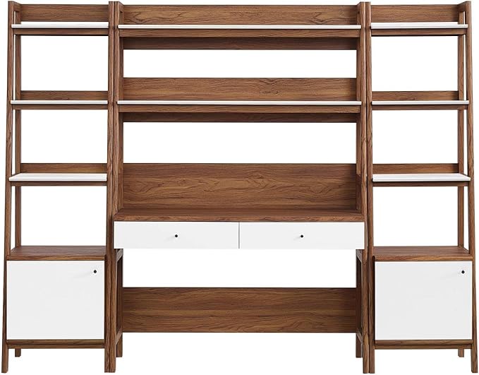 Modway Bixby 3-Piece Home Office Desk and Bookshelf Display Case in Walnut White