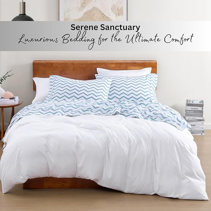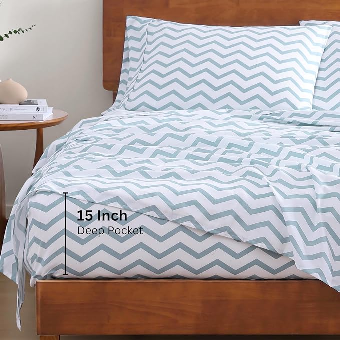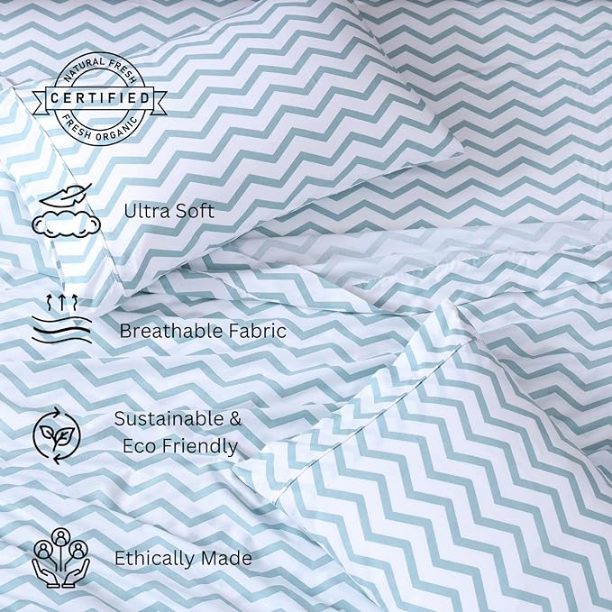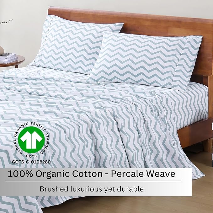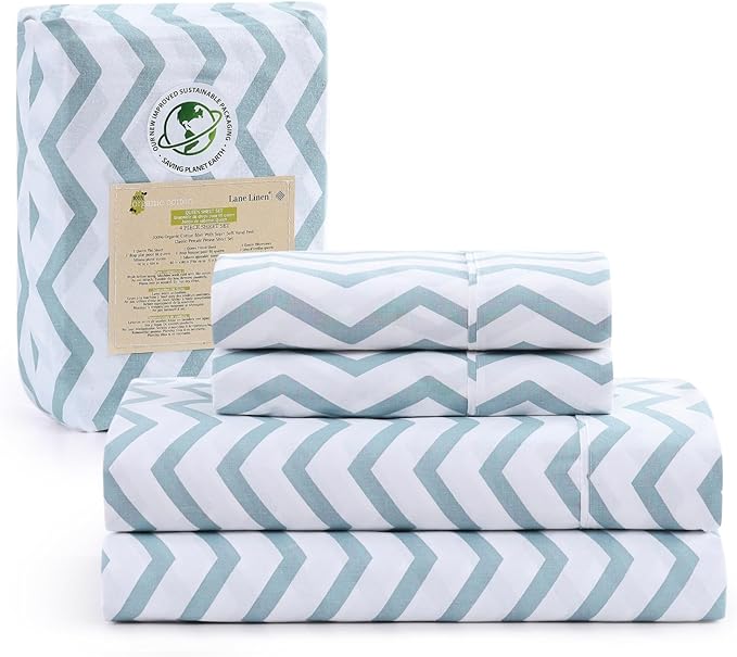 LANE LINEN 100% Organic Cotton Twin XL Sheets Set 3-Piece Pure Percale Bedsheets Bedding Breathable Fits Mattress Upto 15" Deep - Cool Blue Chevron