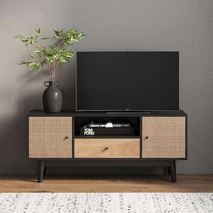 Nathan James Bonnie Modern TV Stand Entertainment Cabinet, Console with a Natural Wood Finish with Storage Doors for Living Media Room, with Drawer, Black Oak/Rattan