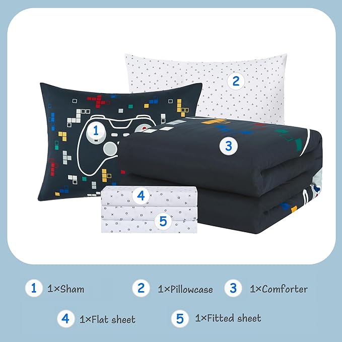 KALEIDOSPACE Kids Bedding Sets for Boys Girls, Glow in The Dark 5 Piece Gamer Twin Bed in A Bag, Ultra Soft Microfiber Kids Bedding for All Season (66"X86"