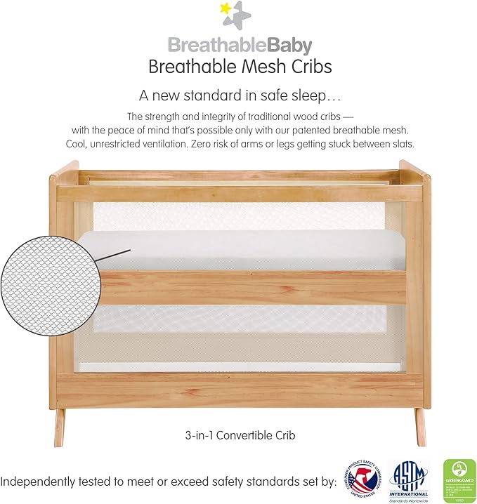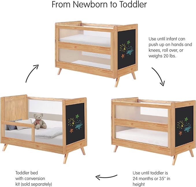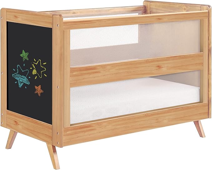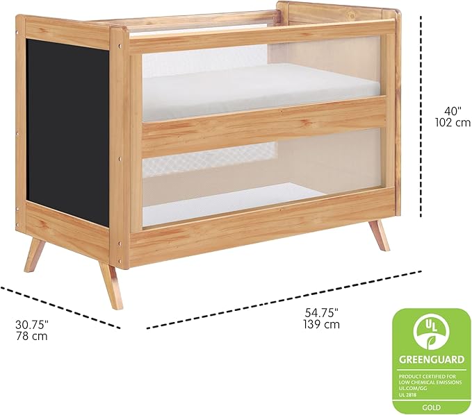 BreathableBaby Breathable Mesh 3-in-1 Convertible Crib (Toddler Bed Kit Sold Separately) — Beech & Chalkboard — Two Adjustable Mattress Heights — Greenguard Gold Certified