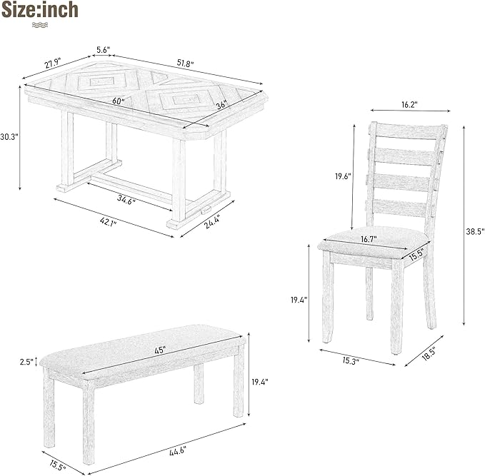 Merax 6-Piece Rubber Dining Table Set with 4 Cushioned Chairs and Bench, Beautiful Wooden Grain Pattern Tabletop, 60 x 36 x 30.3 inch, Natural Wood Wash