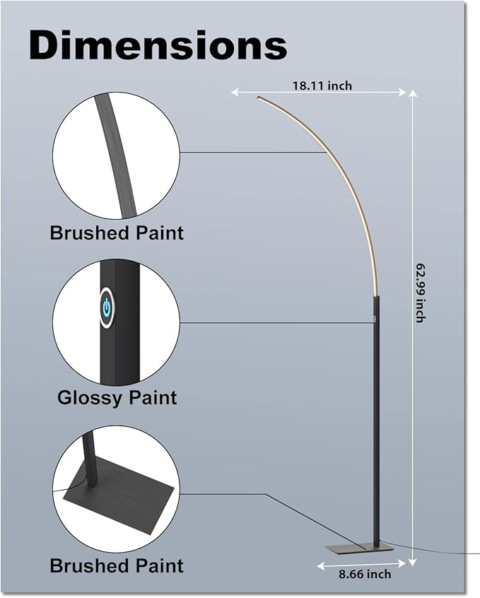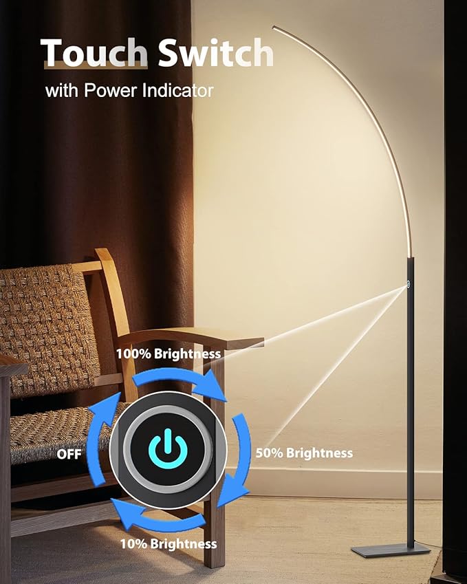 TACAHE Arc Corner Floor Lamp - 3000K Warm White & 3 Brightness Presets - Curved LED Accent Lamp with Touch Switch - 63" Modern Standing Lamp for Bedroom, Living Room - 12W - Black