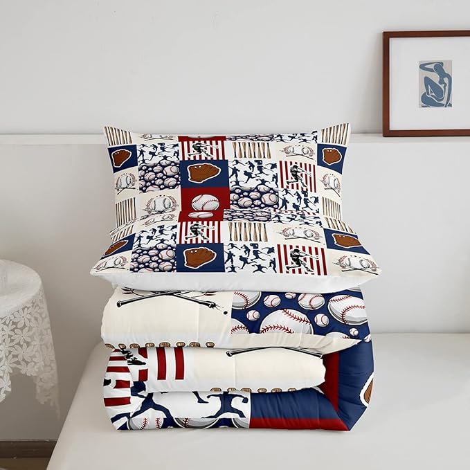 Erosebridal Kids Baseball Twin Comforter Set for Boys,Teen Baseball Athlete Bedding Set Room Decor Sports Theme Bed Comforter Sets Baseball Bat Gloves Quilt Duvet with 1 Pillow Case Red Navy Blue