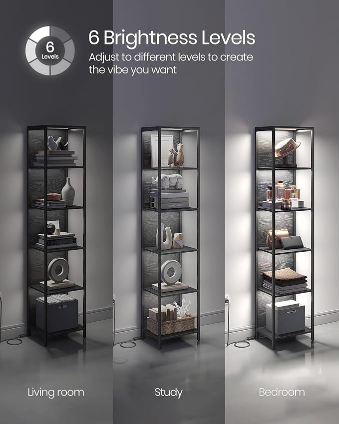 VASAGLE 6-Tier LED Bookshelf, Display Shelf with Dimmable Lights, LED Bookcase with Steel Frame, 11.9 x 15.7 x 70.3 Inches, for Living Room, Bedroom, Office, Black with Wood Grain ULLS121B56