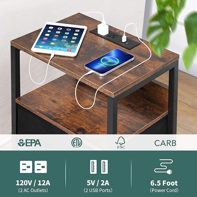 Yoobure Nightstand with Charging Station, Small Night Stand with Fabric Drawers and Storage Shelf for Bedrooms, Nightstands for Small Spaces, Bedside Table with USB Ports & Outlets, Bed Side Table