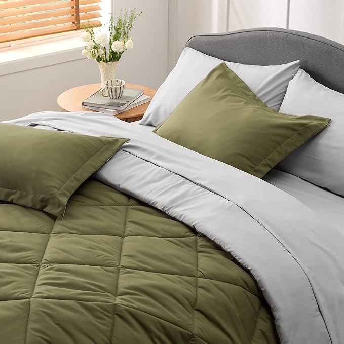 Bedsure Olive Green Queen Comforter Set - 7 Pieces Reversible Queen Bed in a Bag Queen Bed Set with Comforters, Sheets, Pillowcases & Shams, Queen Bedding Sets