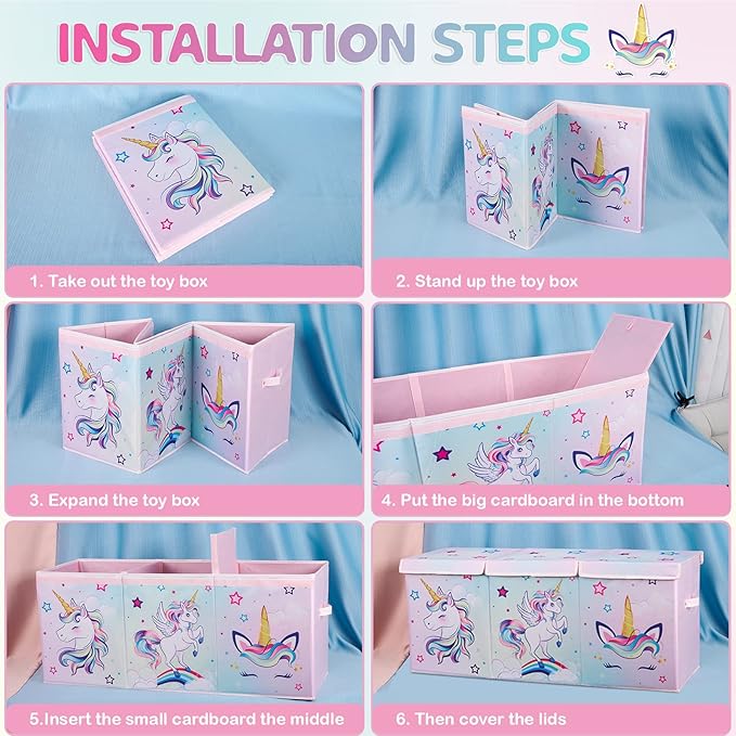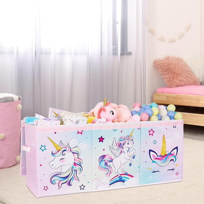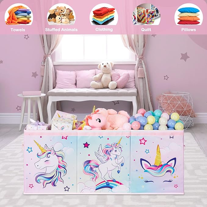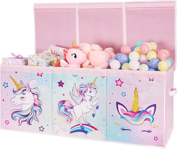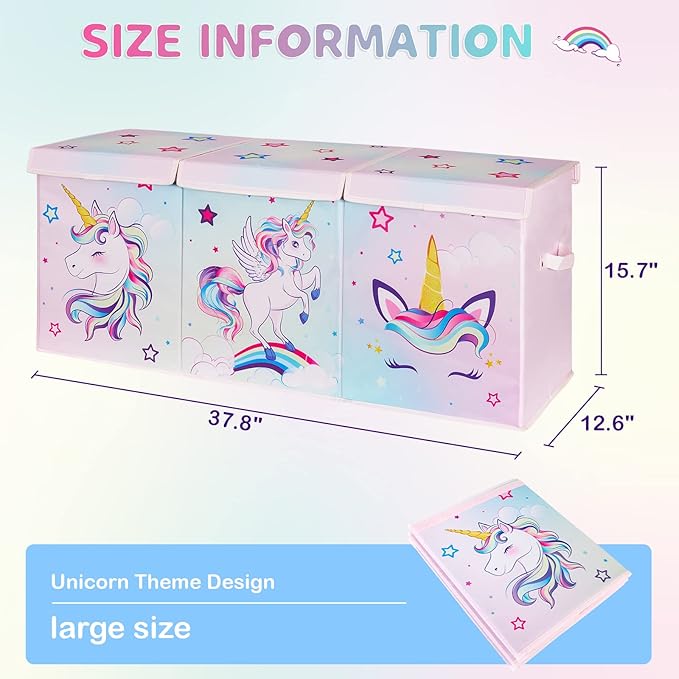 About This UNIQUE DESIGN: There are beautiful unicorn and rainbow design in the front of the toy chest storage. The...