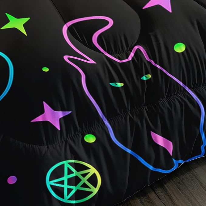Black Cat Bedding Cartoon Cat Comforter Set Twin,Moon Stars Printed Kids Bedding Set for Boys Girls Adults Room Decor,Kids Comforter Set All Season,1 Quilt 2 Pillow Cases,Neon Color Purple Blue Green
