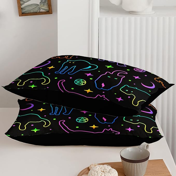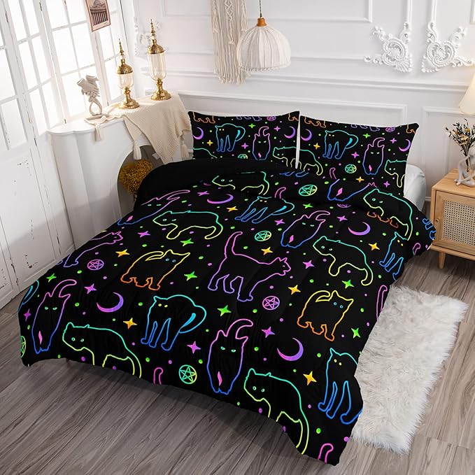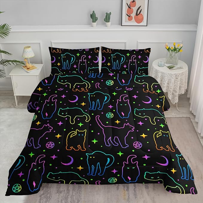 Black Cat Bedding Cartoon Cat Comforter Set Queen,Moon Stars Printed Kids Bedding Set for Boys Girls Adults Room Decor,Kids Comforter Set All Season,1 Quilt 2 Pillow Cases,Neon Color Purple Blue Green