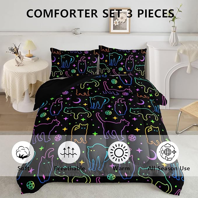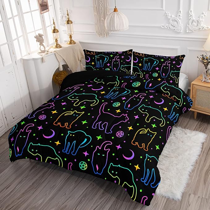 Black Cat Bedding Cartoon Cat Comforter Set Full,Moon Stars Printed Kids Bedding Set for Boys Girls Adults Room Decor,Kids Comforter Set All Season,1 Quilt 2 Pillow Cases,Neon Color Purple Blue Green