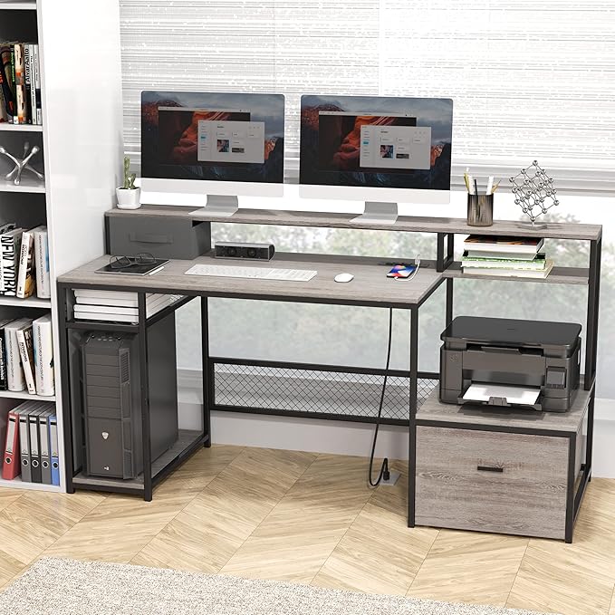 Home Office Desks with Drawers, 66'' Computer Desk with Storage, Office Desk with Monitor Stand, Work Desk with Outlets and USB, Gaming Table Desk with File Cabinet for Home Office Table, Grey