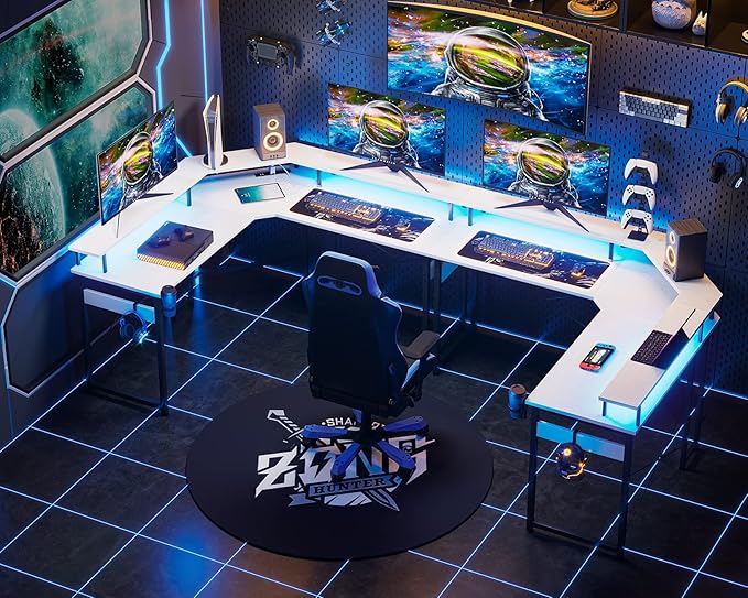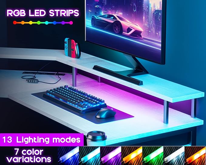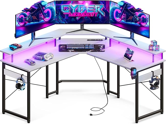 ODK L Shaped Gaming Desk with LED Lights & Power Outlets, 51" Computer Desk with Full Monitor Stand, Corner Desk with Cup Holder, Gaming Table with Hooks, White