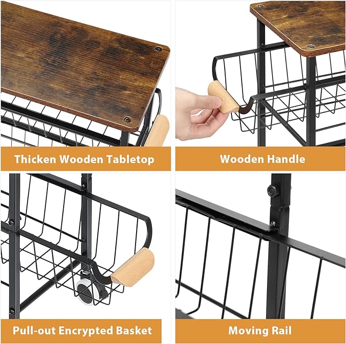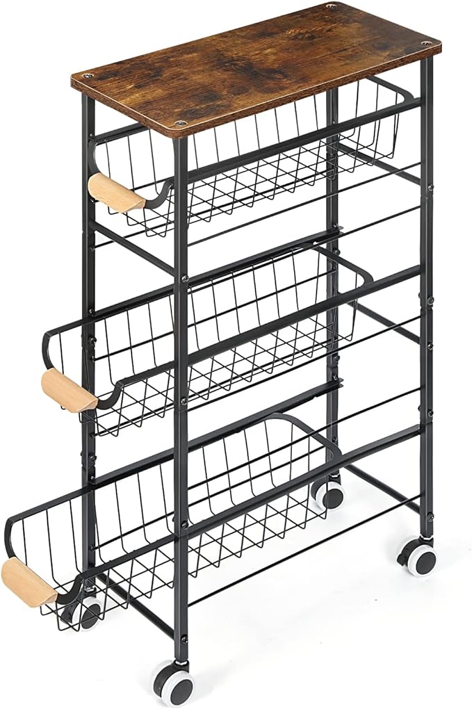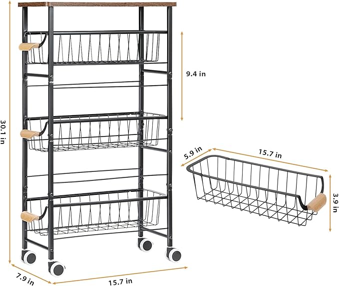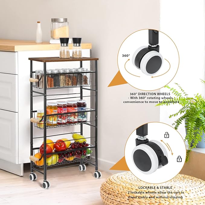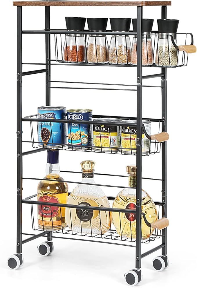 4-Tier Slim Storage Cart, Kitchen Rolling Utility Cart Bathroom Organizer Laundry Room Organization Mobile Shelving Unit with Slide-Out Metal Wire Baskets, Wooden Tabletop & Wheels for Narrow Space