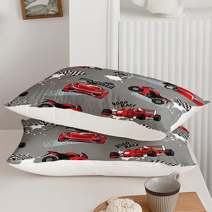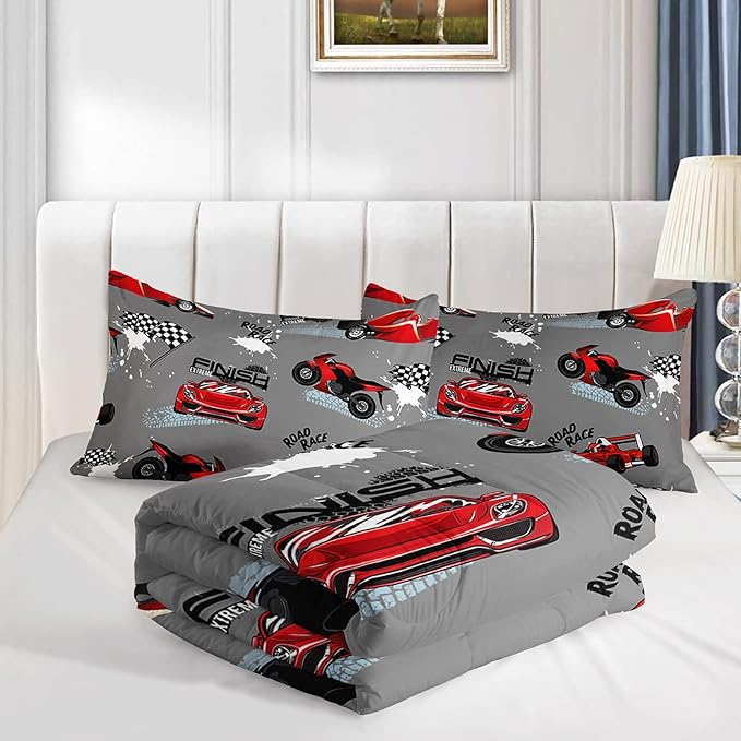 Axolotl Kid Comforter Set Full Size,Racing Car Bedding Set for Boys Girls Teen Car Racing Gifts,Race Cars Quilt Bed Set with 1 Comforter 2 Pillowcases,Red Grey