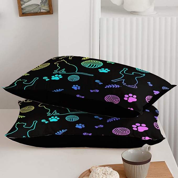 Black Cat Bedding Cartoon Cat Comforter Set Full,Neon Cat Paw Ball of Yarn Printed Kids Bedding for Cat Lover Boys Girls Adults Room Decor,Kids Comforter,1 Quilt 2 Pillow Cases,Neon Color Purple Blue